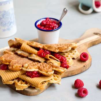 4. Готовьте, пока вафля не станет золотисто-коричневой. Выложите вафлю на противень или тарелку, затем повторите шаг 3.