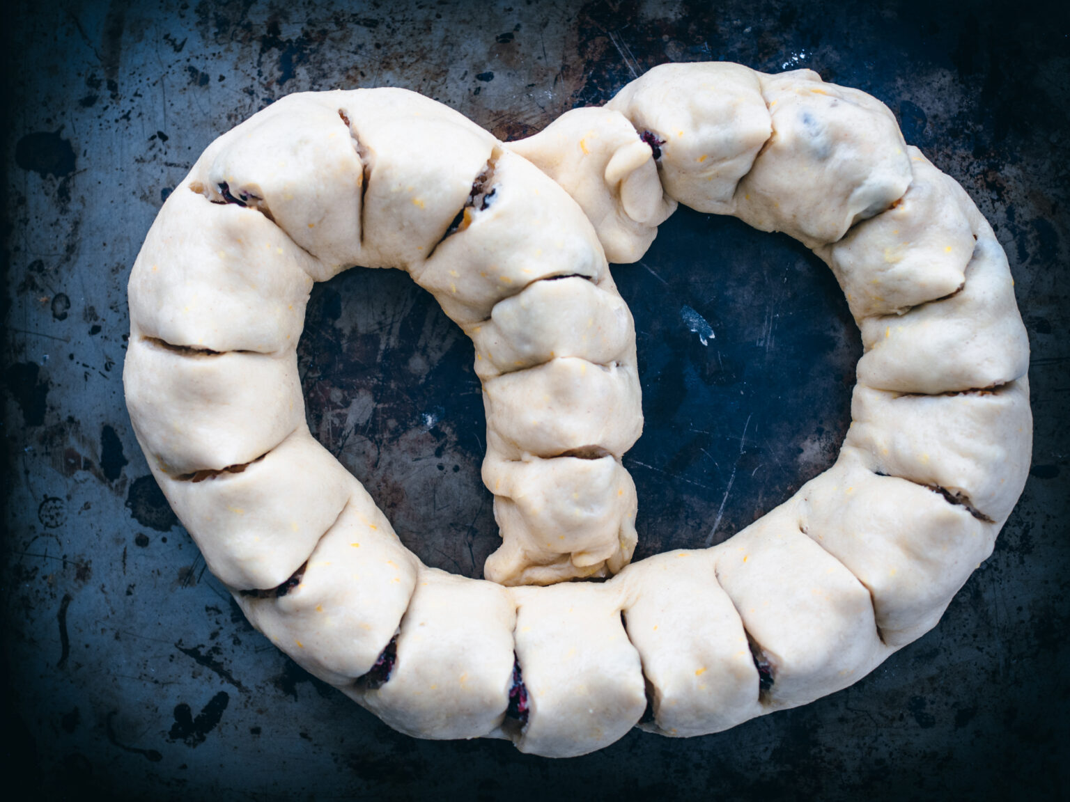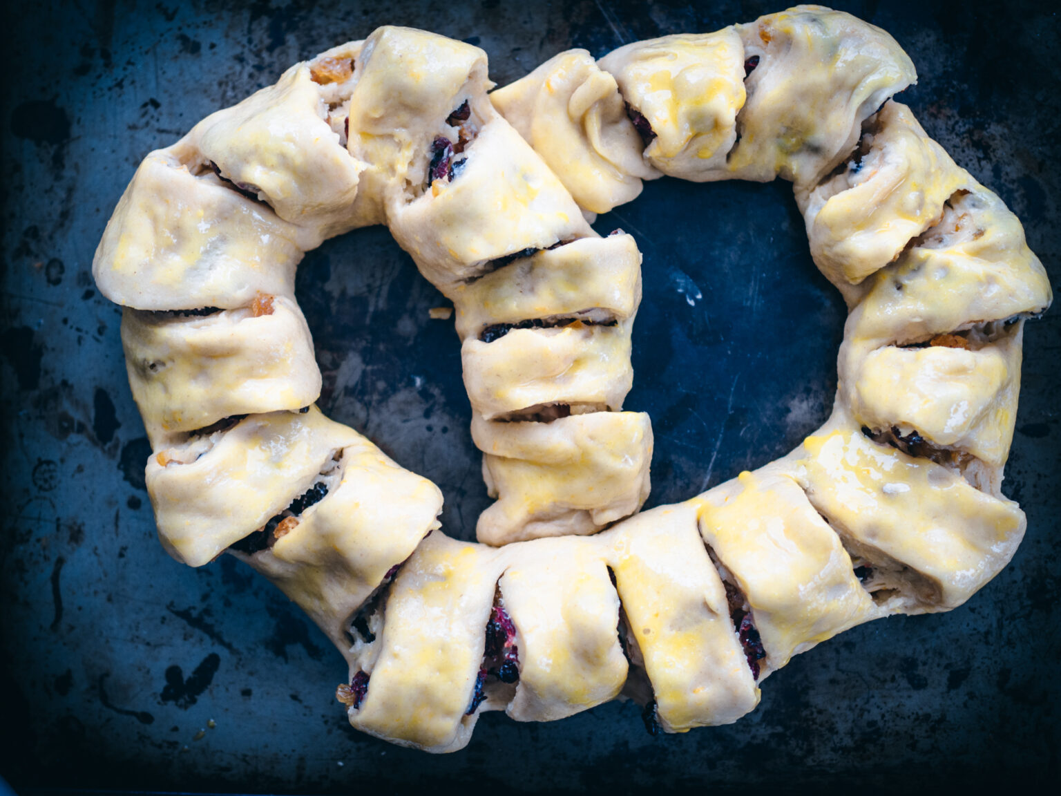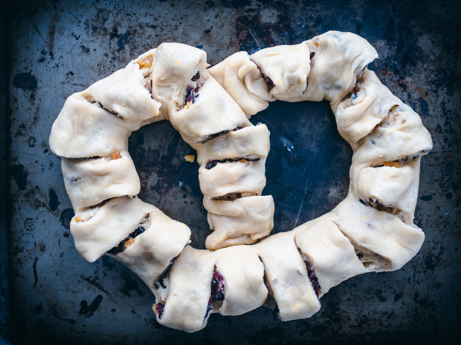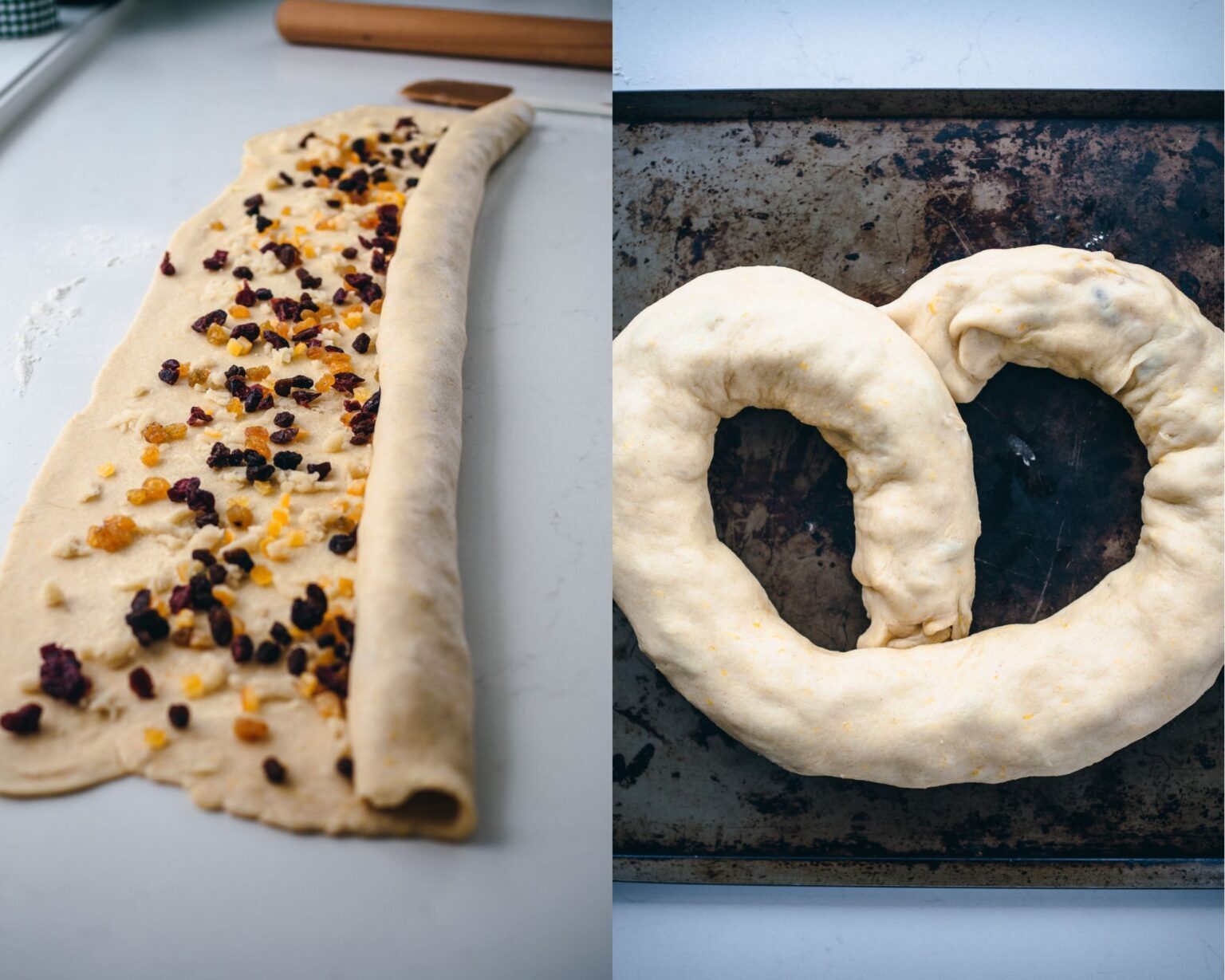 Поместите тесто на слегка посыпанную мукой поверхность. С помощью скалки и дополнительного количества муки по мере необходимости, чтобы предотвратить прилипание, раскатайте тесто в прямоугольник размером примерно 30 x 10 дюймов (75 x 25 см) с горизонтальными длинными сторонами. Используя лопатку, равномерно распределите смесь масла и сахара по тесту, до самых краев, затем посыпьте сверху изюмом, клюквой, цукатами апельсиновой цедры и тертым марципаном. Начиная с одной из длинных сторон, сверните тесто вокруг начинки, чтобы сформировать бревно. Сформируйте из теста крендель, как показано на фотографиях, заправив концы вниз там, где тесто встречается. Сделайте глубокие надрезы, примерно ¾ глубиной, по всему тесту острыми ножницами, стараясь не прорезать тесто насквозь. Расстояние между каждым надрезом должно составлять около 1 ½ дюйма (4 см) друг от друга. При желании можно аккуратно оттянуть один кусок теста в сторону, а затем следующий — в противоположную сторону, разворачивая кусочки теста веером от центра попеременно, пока не будут использованы все. Это придаст более текстурированную форму.