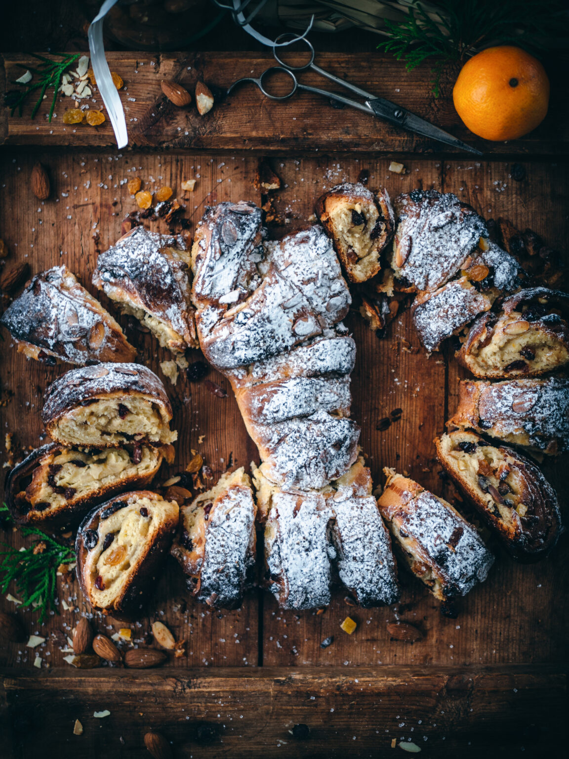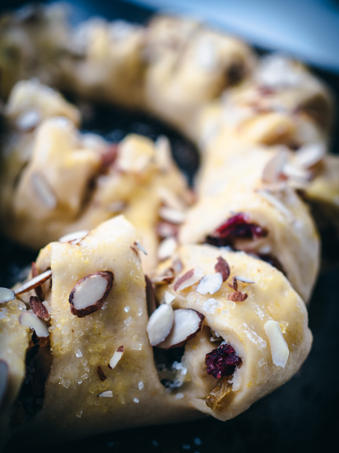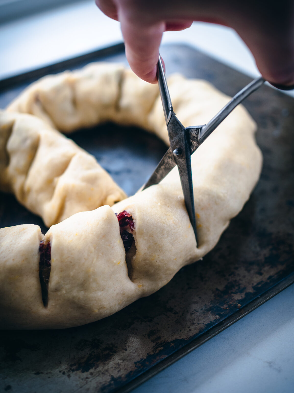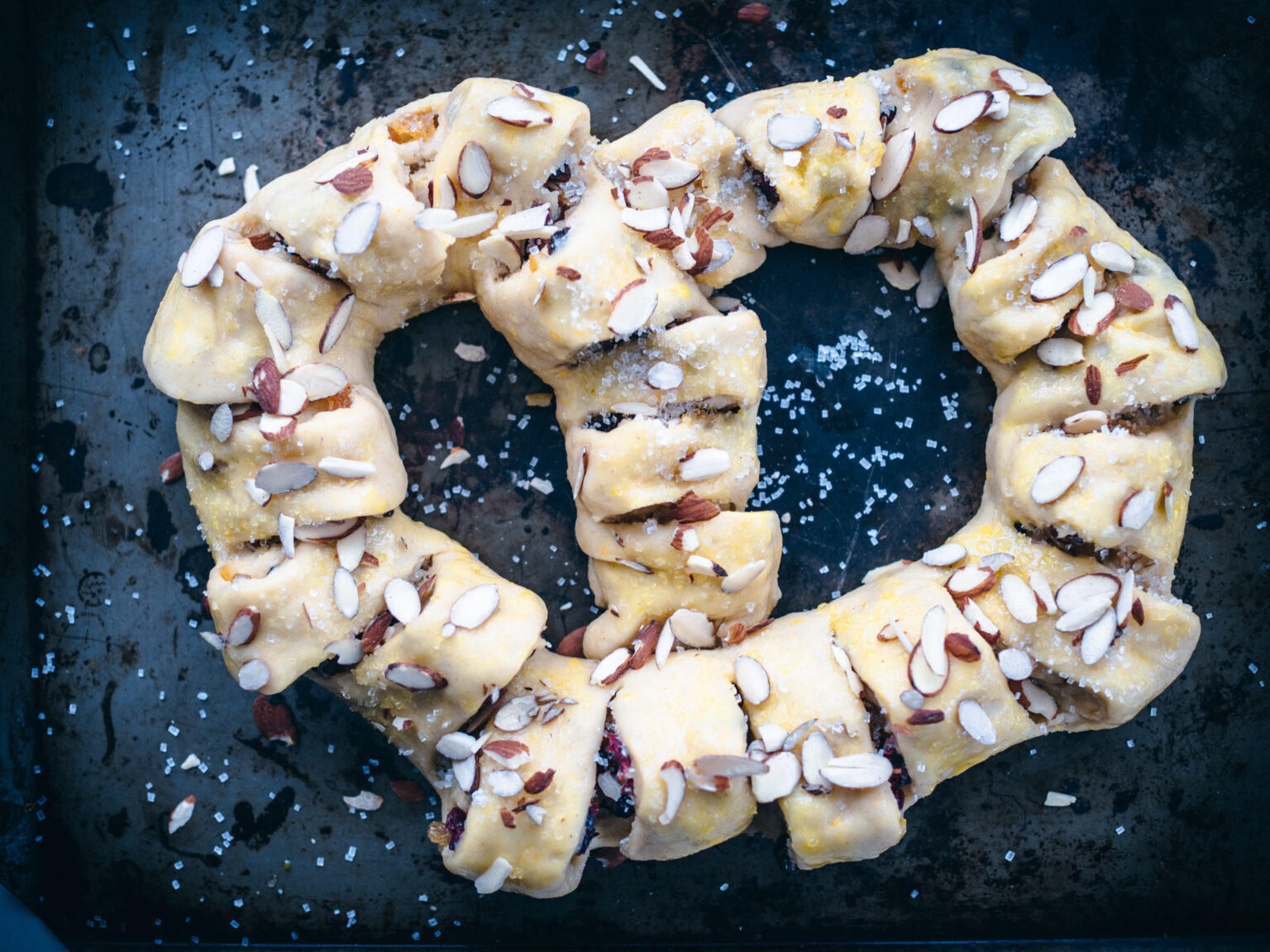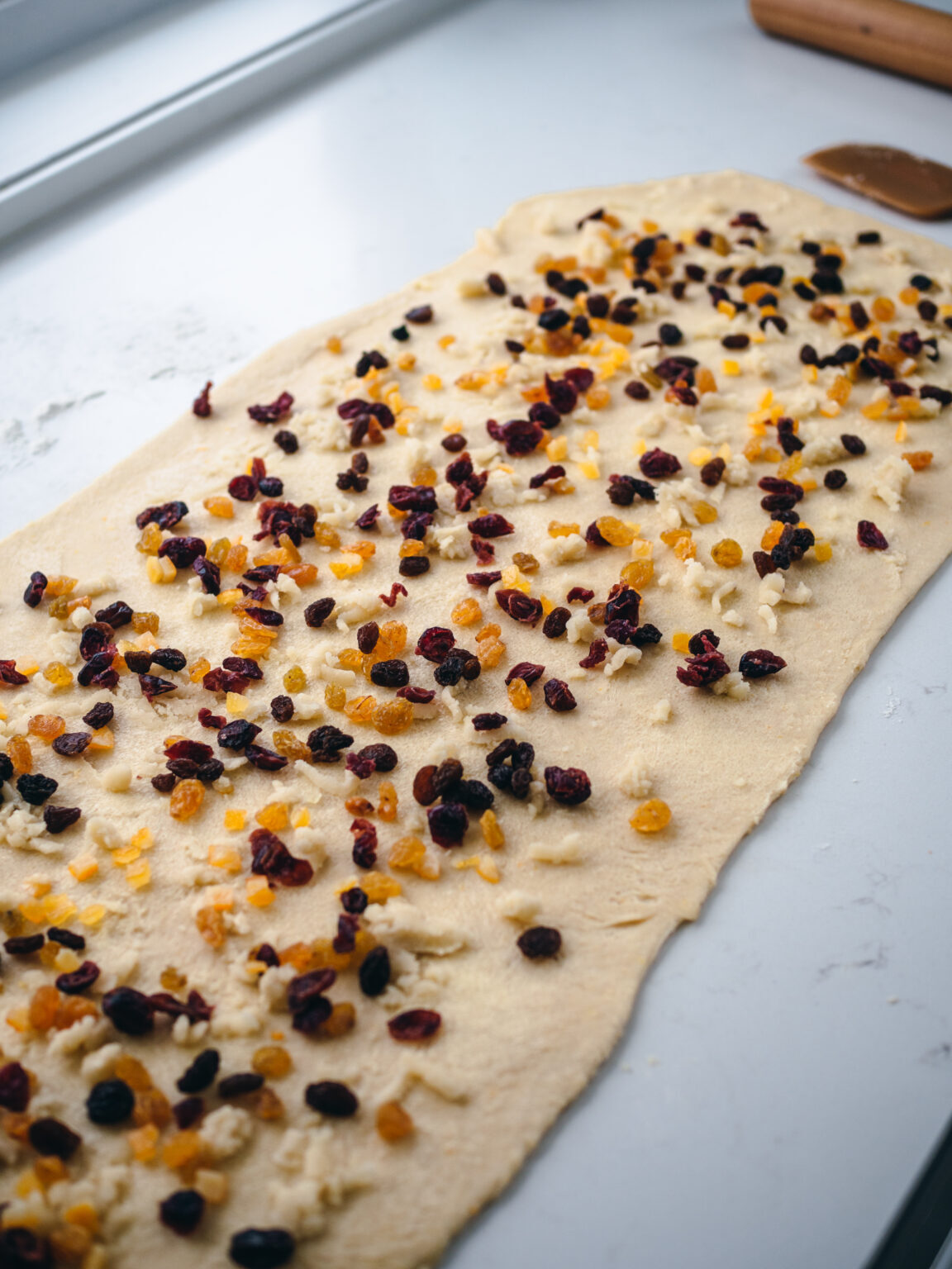 Поместите тесто на слегка посыпанную мукой поверхность. С помощью скалки и дополнительного количества муки по мере необходимости, чтобы предотвратить прилипание, раскатайте тесто в прямоугольник размером примерно 30 x 10 дюймов (75 x 25 см) с горизонтальными длинными сторонами. Используя лопатку, равномерно распределите смесь масла и сахара по тесту, до самых краев, затем посыпьте сверху изюмом, клюквой, цукатами апельсиновой цедры и тертым марципаном. Начиная с одной из длинных сторон, сверните тесто вокруг начинки, чтобы сформировать бревно. Сформируйте из теста крендель, как показано на фотографиях, заправив концы вниз там, где тесто встречается. Сделайте глубокие надрезы, примерно ¾ глубиной, по всему тесту острыми ножницами, стараясь не прорезать тесто насквозь. Расстояние между каждым надрезом должно составлять около 1 ½ дюйма (4 см) друг от друга. При желании можно аккуратно оттянуть один кусок теста в сторону, а затем следующий — в противоположную сторону, разворачивая кусочки теста веером от центра попеременно, пока не будут использованы все. Это придаст более текстурированную форму.