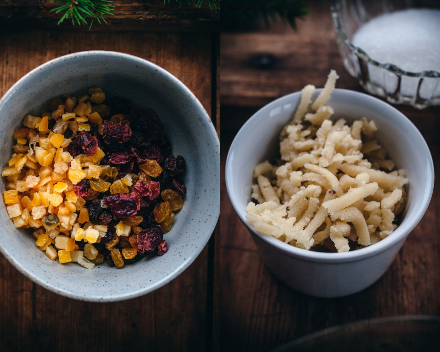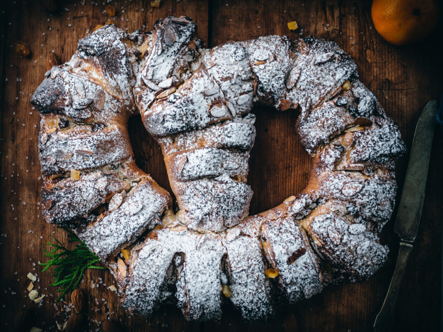 Этот марципановый венок станет сладким дополнением к праздничной выпечке, наполненным изюмом, клюквой и цукатами из апельсиновой цедры. Он идеально подходит для большой компании или просто для того, чтобы побаловать себя. Каждый кусочек сладкий и пикантный, с нотками цитрусовых и миндаля, раскрывающими ароматы этого сезона.